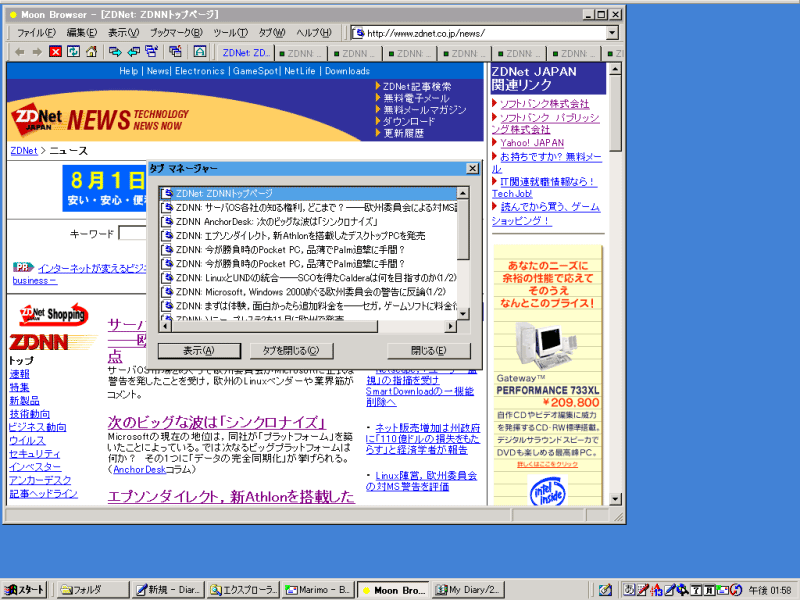 2000/08/19 Moon Browserのご紹介など ちょっと前の日記で「Moonのコトはまた今度触れるとして... 」といっていますが、作者さんからの許可がでたので、改めてMoon Browser(以下 Moon)の紹介です。あ、MoonはIEのコンポーネントを使ったブラウザです。「ブラウザとしてのユーザーインターフェイスを提供しているソフトウェア」といえるのかも知れませんね。 僕はこんなスタイルでMoonを使っています。Moonはカスタマイズ機能も豊富にありまして、僕は初期状態から少しカスタマイズして使っています。タブ幅は固定で1段表示。ツールバーに表示するボタンも標準から減らしていて、配置はこんな感じ。僕にはこれが最高のスタイルです。 上の画像はちょうどZDNNのトップページを開き、ニューストピックを片っ端から開いたという図ですね。20ページ近くを開いていますが、Moonでこれをやってもデスクトップ上がブラウザでいっぱいになるというコトはありません。Moonに出会っていなかったころ、このデスクトップ上にはIEがたくさん表示されていたわけですよ。それがどうでしょう? 実にすっきりとしています(^-^) で、この状態から次々とニュースを読み、読んだタブを終了されたり、ニュース内に興味のあるリンクがあったらまた新しいタブで開くんです。これはですね、なれるとやめられなくなるくらい便利です。タブがたくさんになって画面からはみ出しても大丈夫。タブマネージャーには開いているタブのタイトル一覧が表示されていますでしょう? ここから見たいトピックへすぐ飛べます。 元々がですね、ナローバンドのダイアルアップ環境ですから、今までも「新しいウインドウで開く」を多用していたワケですよ。何が書いてあるかわからないようなページが開くのを待ってから他のページへ移動するなんてやってられませんからね。 #会社の専用線も少し重く感じでしまう今日この頃。贅沢になってきた(^-^; 検索するときも同じです。検索結果がでたら、適当なページを20ほど開いておく。開いている作業中に最初に開いたページからどんどん内容が表示されていきますから、それからおもむろに記事を読み出す。「これは!」と思うページは保留して次のページへタブを移動。「違う」というページはすぐ閉じる。で、結果的に読みたいページ残るので記事をゆっくりと読む... そんな僕にMoonのタブスタイルはピッタリとはまったワケです。 ただし! Moonはまだ発展途上のソフトウェアです。私の環境では(主に会社のNT4.0で使っています)とても安定して動作してくれていますが、これを読んで「Moonだよ!」と思った方の環境でも安定して動くかどうかはわかりません。たぶんですね、僕のように大量のページを開くスタイルの場合、NTカーネルなOSの方が適していると思います。Win9xだとそんな大量のページを開くなんて怖くてできませんし(^-^; 昔の開発日記を読むと... 今回のサイトリニューアルで昔の開発日記を読み返してみたのですが... 昔はこんなに長々と書いていなかったんですね。非常にシンプルです。シンプルの頃はマメに更新していたのかというと... そうでもないようなんですが(^-^; 掲示板 掲示板が昔のままの状態になっています。IEだといちおう背景が表示されますが、Netscapeだと背景が表示されないのでとても見にくいです。これは近日中に修正しようかと思っていたのですが... ちょっとHelpDesigner v1.60に集中したいので来週までこのままかも知れません(^-^; もう少し我慢してください。 2000/08/16 このサイトは頻繁にデザインが変わります(^-^; 予告通りサイトデザインをリニューアルしました。しかしよくころころとデザインが変わるサイトです(^-^; でも今回の変更はちょっと大がかりでした... 今回の変更 今回の変更に伴い、僕のホームページもやっと階層化しました。今まではルートにすべてのHTMLファイルがあって、1つのフォルダの中にすべての画像ファイルがあった... という感じでしたからね。今回はページ毎にちゃんとフォルダを作り、その中にもサブフォルダを作って... と計画的にサイトを構成しました。 (従来のページへのリンクがリンク切れにならないようにダミーのHTMLや画像は配置しています) 左側のメニューもそのページに関連しているページのみのメニューを表示させるようにして、メニューが増える毎にすべてのページに手を入れなければならないという事態を避けるようにしています。 これで今後は積極的にページを更新する体制が整いました。あとは僕がめんどくさがらずにちゃんと更新するようにするだけです(^-^; HelpDesigner v1.60 少しずつ作っていますが... 拡張ショートカットの扱いをどうしようか迷っています。PPAを搭載するとなると拡張ショートカットはいらなくなりますからね。よけいな機能があるコトでファイルサイズが大きくなるのはどういうモノか、と。 しかしPPAは"Poor"とはいえしっかりとしたスクリプト言語です。拡張ショートカットにはついてこれた人でもPPAにはついて